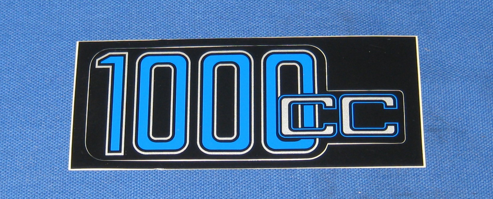 Aufkleber 1000 cc in blauer Schrift mit silberner Umrandung,